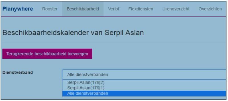 - In het veld Dienstverband selecteert u het dienstverband waarvoor u de terugkerende beschikbaarheid vast wilt leggen. U kunt hier alleen een keuze maken indien u meerdere dienstverbanden hebt.