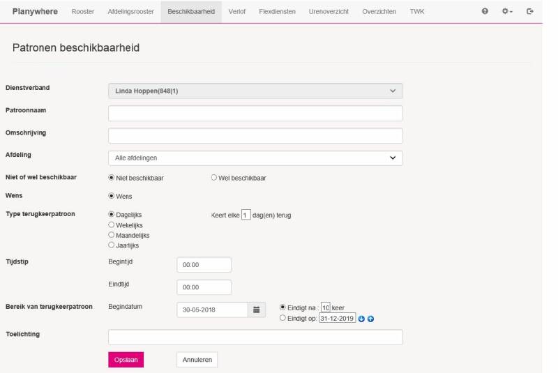 U kunt deze beschikbaarheden stuk voor stuk vastleggen, maar het vastleggen van deze wensen in de vorm van een terugkerend patroon is eenvoudiger en gaat een stuk sneller. Een beschikbaarheidspatroon heeft altijd een ingangsdatum en een einddatum. De einddatum mag nooit later vallen dan 31 december van het volgende kalenderjaar of dan uw datum uit dienst, als uw contract eerder eindigt dan 31 december van het volgende kalenderjaar.