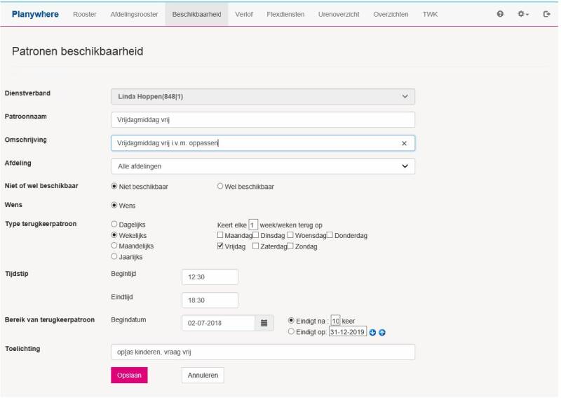 - Een beschikbaarheidspatroon moet altijd een naam hebben. Hierin kunt u bijvoorbeeld aangeven dat u graag op maandagavond vrij wilt zijn of elke eerste en derde donderdag van de maand kan werken. Het is niet mogelijk om meerdere beschikbaarheidspatronen vast te leggen met dezelfde naam.