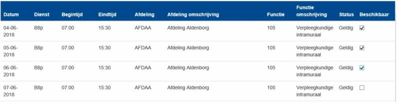 Als de aanvraag voor de flexdienst gehonoreerd is, dan kunt u in de kolom Ingepland eigen dienstverband zien of deze dienst door u gewerkt wordt (uw naam wordt getoond) of door een collega (in de kolom staat Nee).