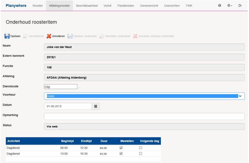 11. Wilt u de dienst vastleggen, dan klikt u op de knop Opslaan. Wilt u uw invoer niet opslaan, dan kunt u klikken op de knop Annuleren. U keert vervolgens terug in het afdelingsrooster.